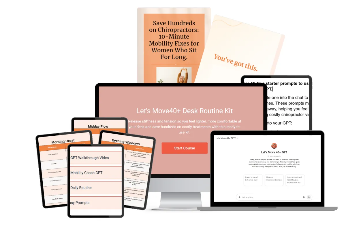 Release stiffness and tension so you feel lighter, more comfortable at your desk and save hundreds on costly treatments with ready-to-use morning, midday, and evening flows, plus personalized AI-powered routines and prompts designed for women 40+ who sit for hours building their business